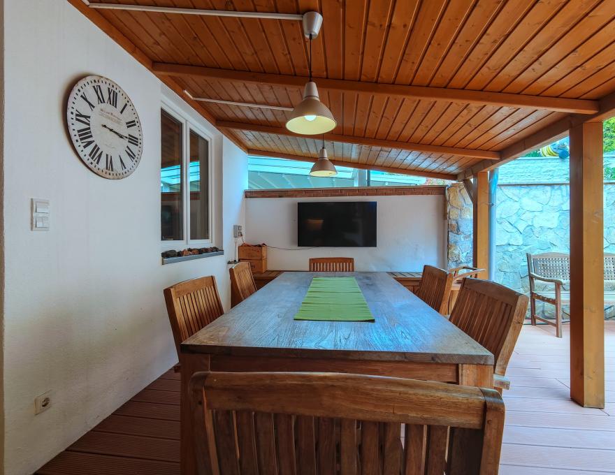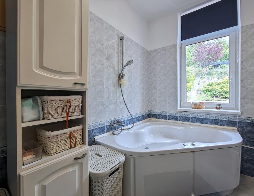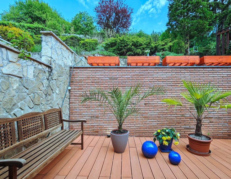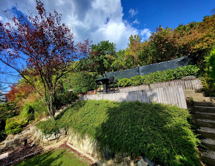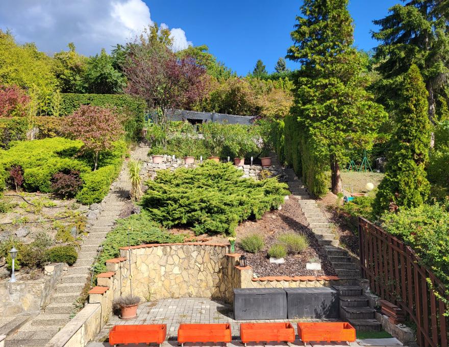 A kert teraszos kialakítású, kertépítész által tervezett. A telek felső részén további két teraszról élvezhető a lenyűgöző panoráma – ideális reggeli kávéhoz vagy esti beszélgetésekhez.