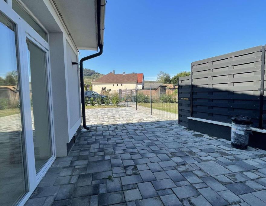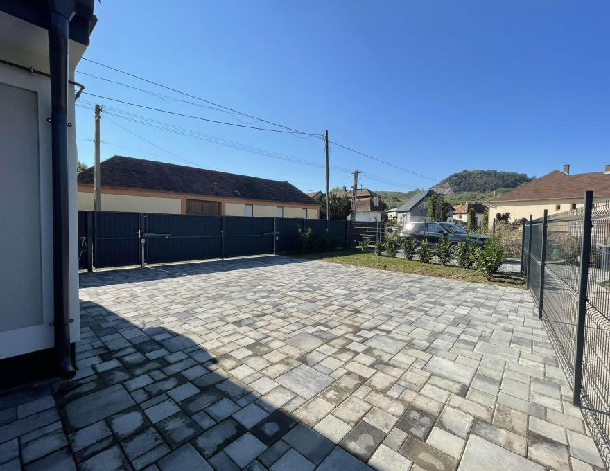 Eladó Tokodon a Kossuth Lajos utca központ felé eső részén egy új építésű, 90 m2-es, 2 szoba+nappalis családi ház. Az előszobából jobbra az amerikai konyhás nappali nyílik egy háztartási helyiséggel. A nappaliből közelíthetjük meg a hálószobát és az egyik fürdőszobát is. Az előszobából, a bejárattal szemben helyezkedik el a másik hálószoba egy külön zuhanyzóval. A nappaliból egy teraszra lépünk ki. A kert 350 m2-es akár 2 autó részére is alkalmas gépkocsibeállóval. Az ingatlanban beépített, gépesített konyha, klímaberendezés is rendelkezésre áll. Rezsije a modern építési technológiáknak, hőszigetelésnek, nyílászáróknak köszönhetően rendkívül alacsony.